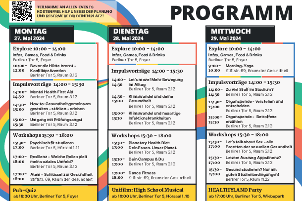 Spaß und Raum für Austausch mit fachlichem Input kombinieren, dafür steht das HEALTHYLAND. In diesem Jahr haben wir wieder ein buntes Programm für euch vorbereitet. Erkundet das Programm und meldet euch hier direkt für Impulsvorträge und Workshops an - first come, first serve!