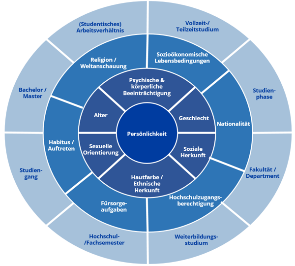 - Diversity-Rad: Die Abbildung zeigt relevante Diversity-Dimensionen für Studierende an Hochschulen. Zentral und schwer veränderlich sind dabei Geschlecht, soziale Herkunft, Hautfarbe/ethnische Herkunft, Alter, psychische und körperliche Beeinträchtigung sowie sexuelle Orientierung. Verschränkt mit variableren Aspekten wie Studienort, Familienstatus, Religion oder Teilzeitstudium ergeben sich daraus spezifische Ressourcen, Erfahrungen und Fähigkeiten, die Studierende mitbringen.